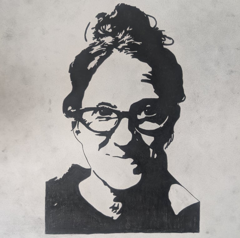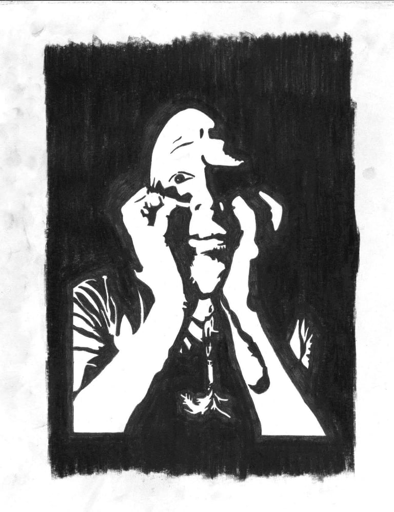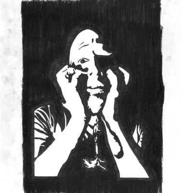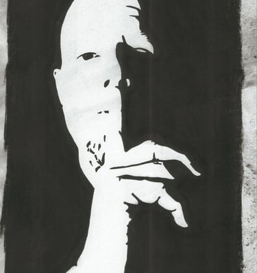 A striking charcoal drawing that powerfully depicts the act of shushing. Rendered in stark black and white, this high-contrast piece symbolizes the pervasive stigma surrounding mental illness and the painful necessity for individuals to conceal their struggles from certain people and situations. It speaks volumes about the hidden battles fought in quiet.