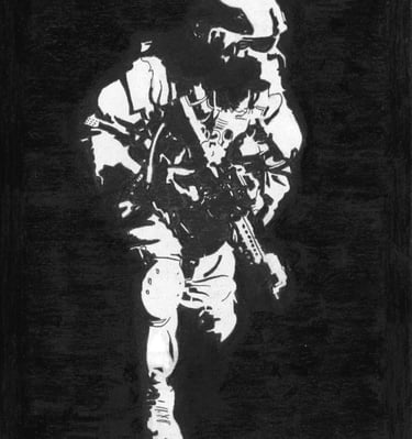 A powerful charcoal drawing that captures a Delta Force operator in a moment of intense motion and unwavering resolve. This piece vividly portrays the readiness and courage required to charge directly in the fray, embodying a decisive transition into action. The high-contrast black and white style amplifies the drama and the powerful sense of impending conflict.