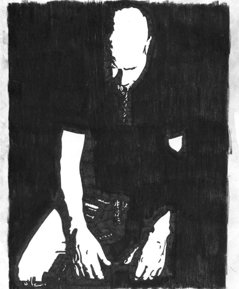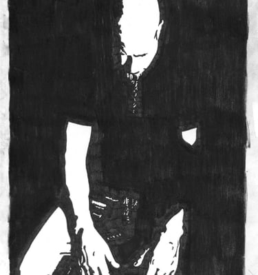 A powerful charcoal drawing that vividly portrays the insidious onset and deepening progression of mental illness,, such as depression. The stark figure, increasingly obscured and dissolving in the profound blackness, masterfully conveys the overwhelming sense of withdrawing from the world and slipping deeper into the encompassing darkness that defines a depressive state. This high-contrast piece serves as a raw and honest visual echo of the soul's quiet descent.